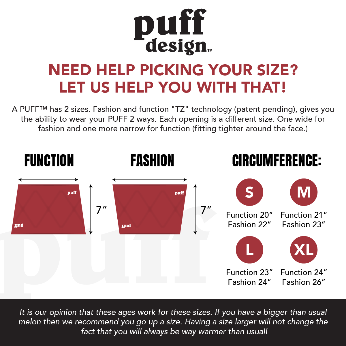 PUFF™ is created with TZ Technology (patent pending) which is tapered at one end so kids can wear it two ways. Tapered end down for mild days in the backyard or playground; tapered end up for a snug, face-protecting fit for cold toboggan rides. 2 options: Fashion & Function'.